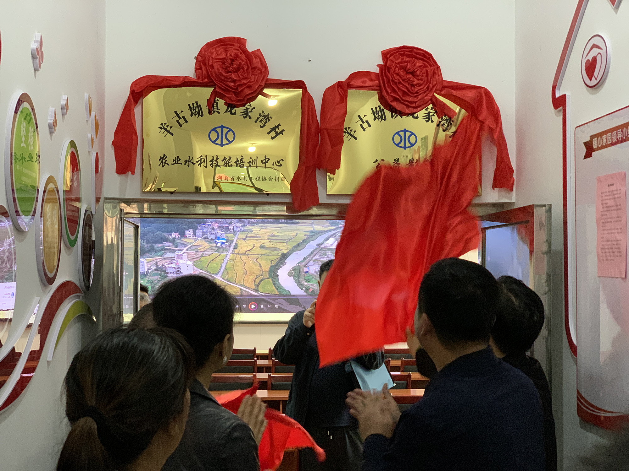 參加活動的領導嘉賓還參觀了龍家灣村人民廣場及村部院落升級改造項目,為村農業(yè)水利技能培訓中心和村公益影院揭牌。